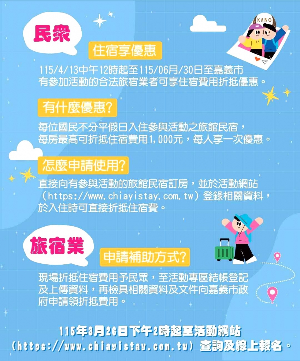 鄭處長表示,嘉義市國旅自由行住宿補助已經開跑,每房每晚最高可申請1,000元補助,活動採線上申請機制,旅客完成登錄後即可向合作旅宿訂房,自115年4月13日起實際入住後即可享有住宿補助優惠。