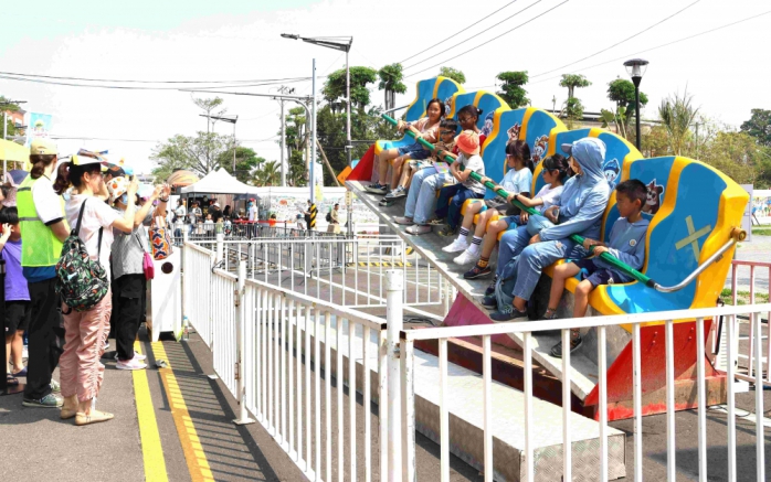 張縣長表示,膨鼠公園搖身一變成為充滿歡樂的兒童樂園,現場設有氣墊城堡、摩天輪、旋轉木馬、小火車、海盜船、炫風飛車、水泥扭蛋車、搖擺飛飛、漂浮熱氣球及飛天魔椅等大型遊具,結合緊鄰的人文親水公園,處處洋溢親子歡笑聲。