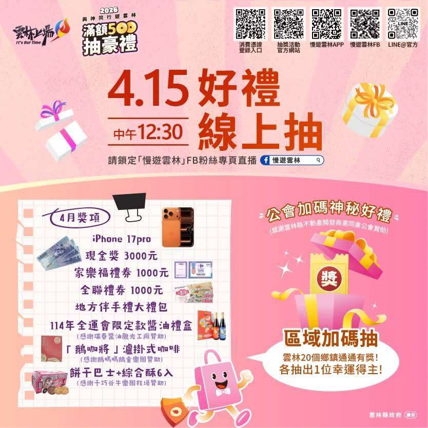 透過階段性、多節點的抽獎規劃,不僅延長活動熱度,也有效帶動消費循環。首場「線上抽好禮」將於4月15日登場,獎項包含iPhone手機、現金獎、通路禮券及雲林特色伴手禮等,內容豐富多元。