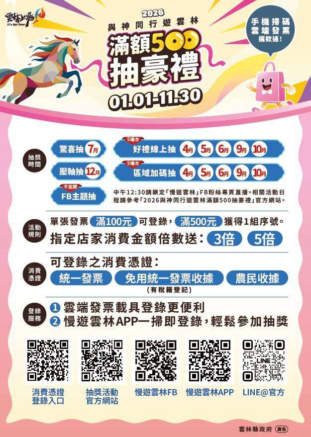 此外,「2026與神同行遊雲林滿額500抽好禮」活動自即日起至11月30日持續辦理,民眾於縣內消費累計每滿500元即可獲得1組抽獎序號,累積越多,中獎機會越高。