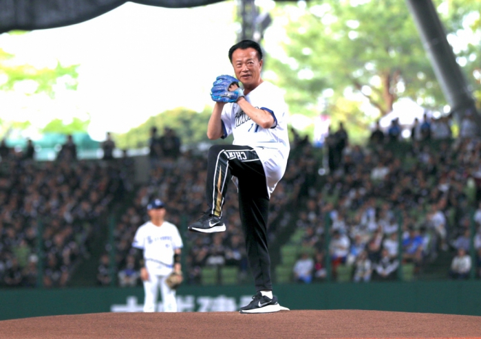昨晚賽事的重頭戲,由翁章梁縣長擔任開球嘉賓。翁縣長身穿特製球衣登上投手丘,在全場觀眾見證下投出強而有力的一球。