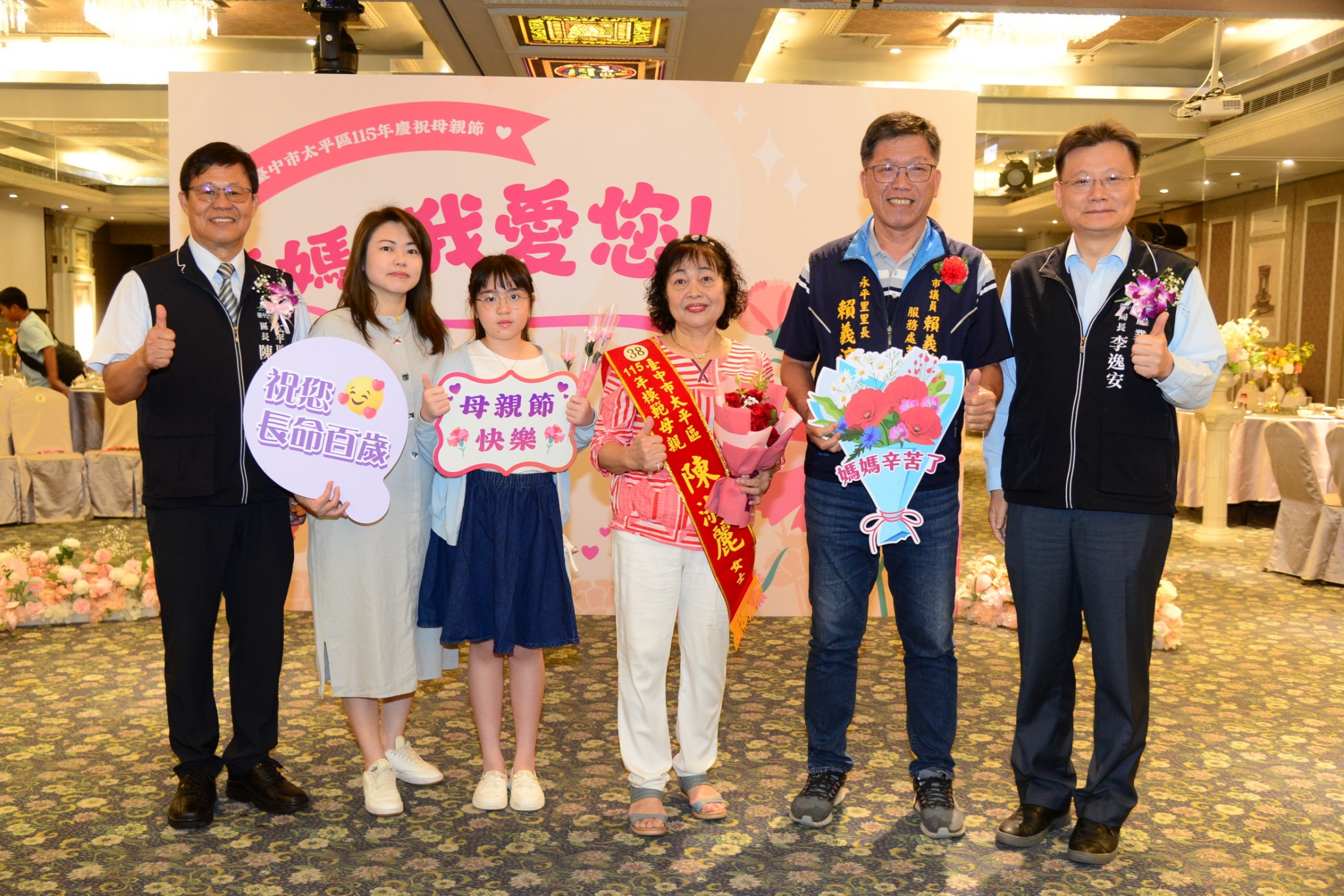 今年活動由台中市農業局長李逸安與太平區長陳柏宏代表市長盧秀燕,向46位模範母親獻上誠摯祝福。模範母親們戴上象徵美麗與榮耀的花冠,在里長陪同下走過紅毯,並由局長致贈「慈母馨芳」獎牌,表達最高敬意與感謝。活動現場台上台下齊聲高喊「媽媽!我愛您!」,洋溢溫馨與感動。