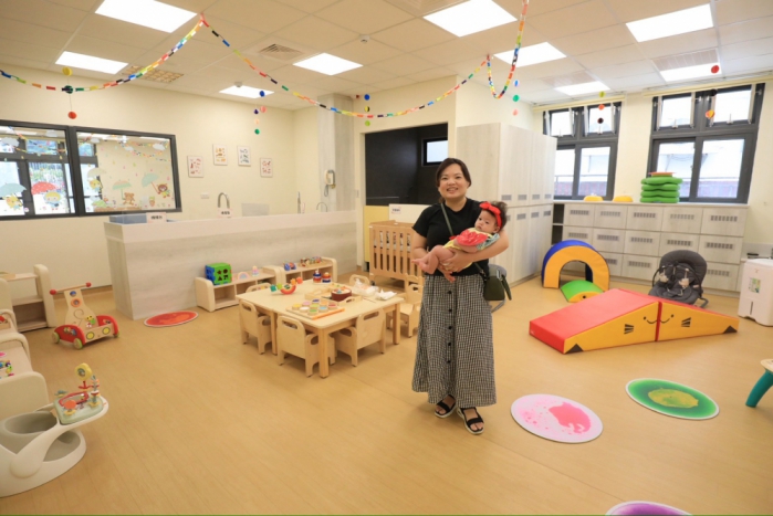盧市長說明,南區兒少家庭福利館一樓公托收托0至2歲幼兒,家長自付額1,500元,換算每天僅50元,為六都最便宜;照顧比為1:4,優於中央規定的1:5,為全國最好。二樓親子館服務0至6歲幼兒,提供冷氣空間、遊戲設施、說故事課程,並首創免費玩具出借服務,使用後消毒再循環利用,提供安全、溫馨且專業的照顧環境。