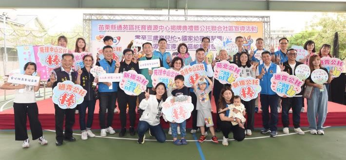 苗栗縣通苑區托育資源中心揭牌典禮,今天上午在苑裡客庄國小風雨球場舉行,委由社團法人台灣新世代親子關懷協會營運,正好為通苑地區原有的4家公設民營托嬰中心,補上托育政策最後一塊拼圖,未來將服務通霄、苑裡及三義地區家有0至3歲幼兒的家庭,透過整合性資源,讓家長在育兒路上減緩照顧壓力。