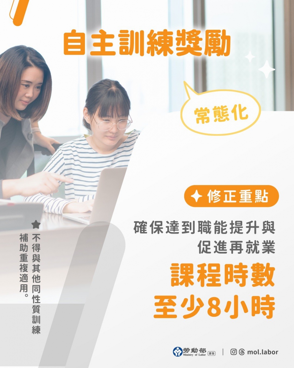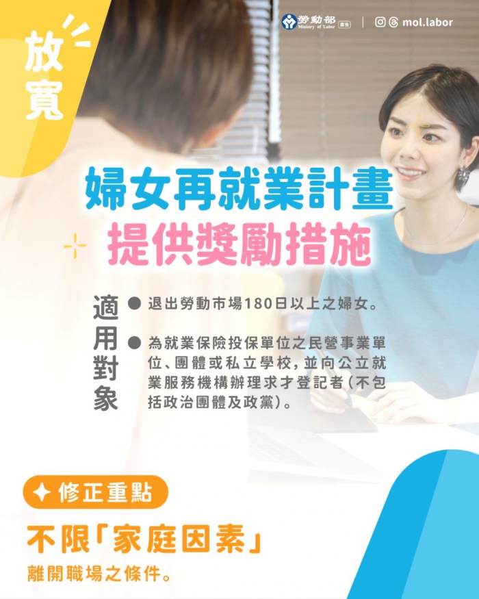 同時,再就業獎勵也由原本需就業滿90日一次發給3萬元,調整為每滿30日即可請領1萬元,最高可領6萬元,讓婦女在重返職場初期,即便無法適應也不用再硬撐90日,就能獲得更即時的支持與鼓勵,減輕重新適應工作的壓力。