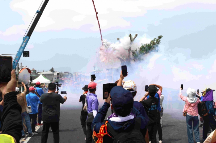 今天下午約1點半大甲媽祖進香遶境隊伍到達崙子大橋,施工廠商以吊車吊起6樓高的鞭炮熱鬧迎接,張縣長率領縣府團隊在橋頭接駕,鑾駕轉進橋頭旁施工團隊設的香案處短暫停留。