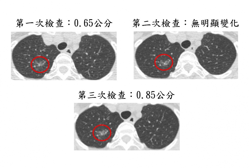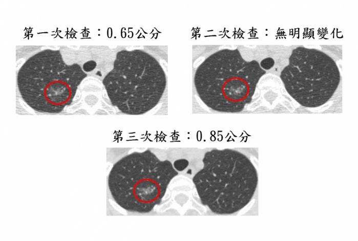 該名56歲女性病人本身不吸菸,但因慢性咳嗽持續三個月就醫。初步X光檢查並無異樣,但醫師考量其家族史顯著(大姐罹患肺癌、二哥鼻咽癌、二姐乳癌),因此安排公費LDCT檢查,結果發現約0.65公分病灶。安排半年後第二次追蹤,病灶無明顯變化,但再半年後的第三次追蹤,病灶已增長至0.85公分。