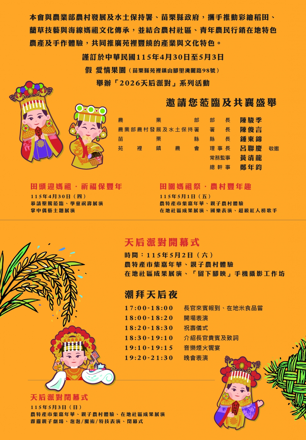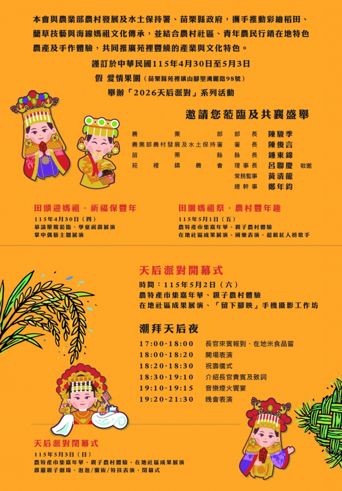(特派員劉鳳瑩、陳明/苑裡報導)近年,全國最具指標性的農遊媽祖文化盛典「2026天后派對」,即將於4月30日至5月3日勞動節連假,在苑裡「愛情果園」盛大展開!在農業部農村發展及水土保持署、苗栗縣政府攜手合作支持下,苑裡鎮農會統籌辦理,今年邁入第三屆,規模更勝以往,首度串聯台中苗栗海線九大宮廟(大甲鎮瀾宮、竹南后厝龍鳳宮、後龍慈雲宮、白沙屯拱天宮、通霄慈后宮、通霄慈惠宮、苑裡慈和宮、苑裡房裡順天宮、苑裡慈護宮),九位女神齊聚駐駕苑裡愛情果園,農會號召全鎮16個農村社區共同參與分工,展現出社區強大的凝聚力,並為2027年即將在苗栗舉行的「台灣燈會」提前暖身!結合彩繪稻田、天后神選商品與山盟海寺農遊,苗栗縣政府農業處正如火如荼地,全力協助該地區申請劃定第12個「灣麗休閒農業區」,期盼藉由此次整合農村產業與常民信仰文化的嘉年華,向外界展現苑裡具備推動高質感農遊的實力。