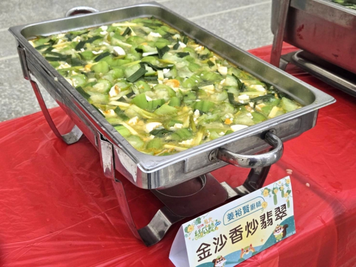 現場由斗六施瓜寮社區勁歌熱舞歡樂開場,並邀請義峰高中餐飲科主任許宇呈現場講解與示範「清拌玉翡翠」創意料理,另由斗六知名總舖師阿賢師姜裕賢親自掌廚,結合當季食材與辦桌料理手藝打造絲瓜buffet饗宴。