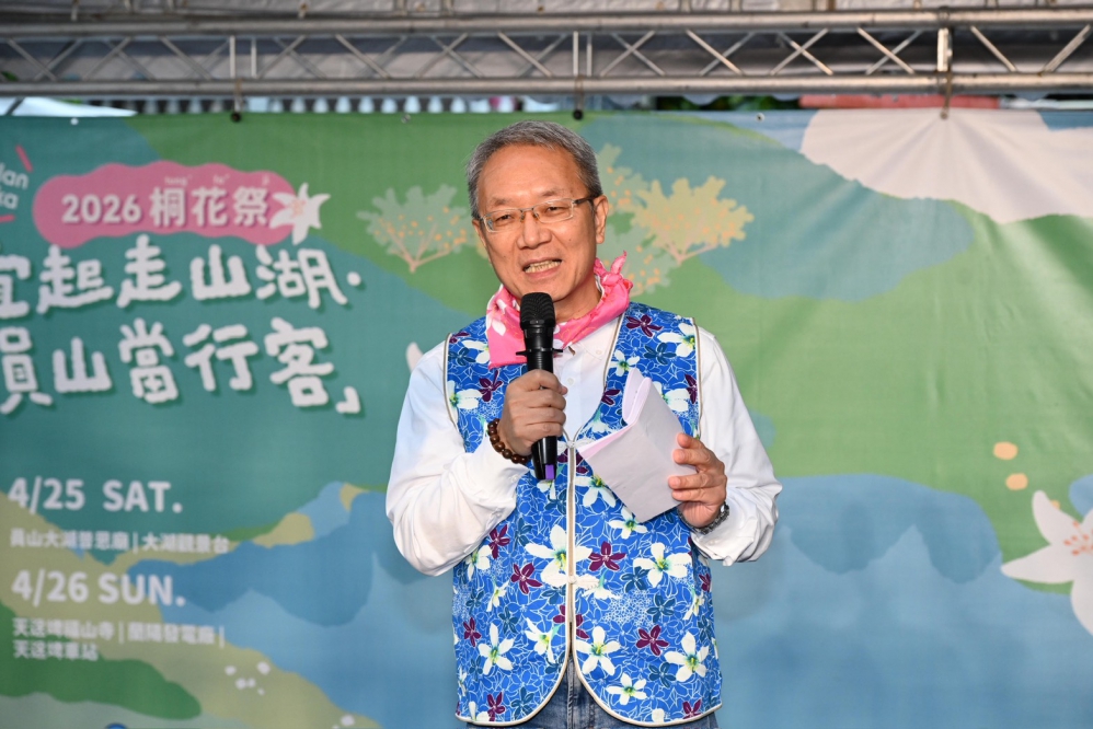 【記者林欣怡/宜蘭報導】春暖花開、桐雪紛飛,2026宜蘭桐花祭今(25)日在員山鄉大湖普恩廟前廣場熱鬧登場。今年活動以「宜起走山湖・員山當行客」為主題,結合桐花健行、藝文展演、好客市集、數位集章及客家美食體驗,邀請鄉親與遊客走入宜蘭客庄,在春日山林間賞桐、健行、聽音樂、逛市集,一同感受自然景觀與客家文化交織而成的迷人風景。