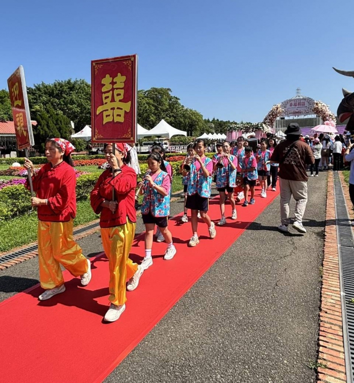 婚禮在悠揚樂聲中揭開序幕,現場搭配苗栗客家八音伴奏,依循傳統古禮迎親,引領36對新人踏上紅毯進場,在古樸而隆重的儀式氛圍中,展現婚禮的典雅與深情;今年亦融入創新儀式,於舞台中央設置象徵團圓與凝聚的「桐花幸福石臼」,結合客家「搗糍粑」習俗,新人代表合力搗麻糬,寓意夫妻同心、攜手打拚未來,並透過「交杯餵食麻糬」儀式,在甜蜜互餵的瞬間傳遞濃濃愛意,以沾滿花生粉的香甜滋味象徵情感緊密、幸福相守,為整體婚禮增添溫馨且洋溢愛情的甜蜜亮點。