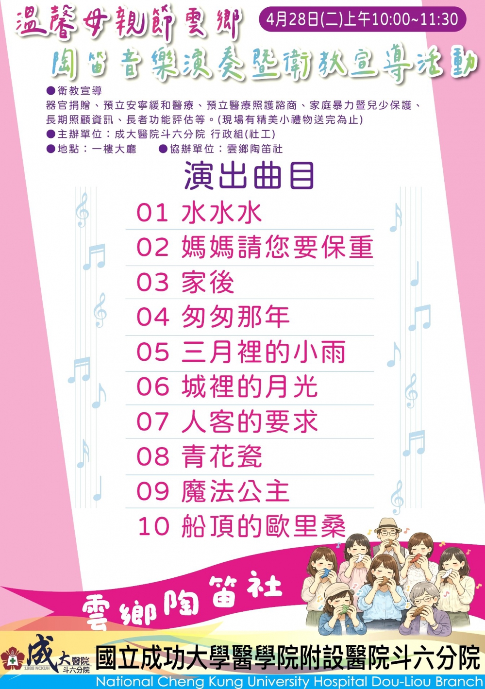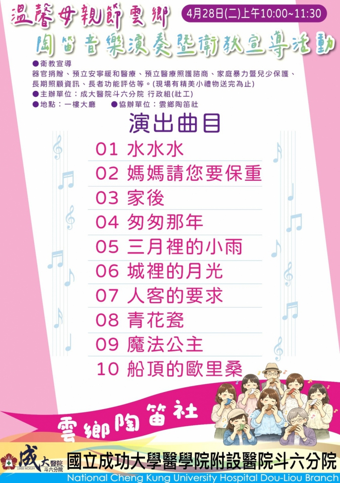 活動在斗六分院1樓大廳舉行,特別邀請「雲鄉陶笛社」帶來「媽媽請您也保重」、「家後」等多首溫馨且讚頌母親的經典樂曲。