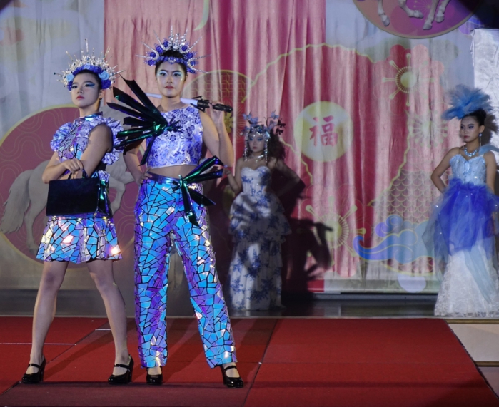 與許艷方同組的洪詩芸表示,創作初期曾遇到瓶頸,後來透過網路觀摩逐漸找到方向,她的作品以馬甲為主體,搭配布料摺疊設計,營造立體蓬鬆效果,並利用使用過的假髮剪碎重製成頭飾,兼具環保與創意。