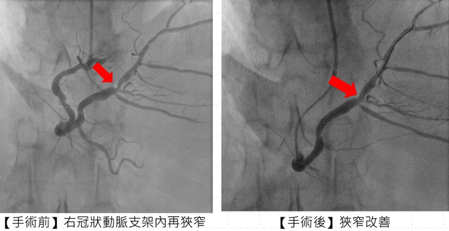 圖:治療前與治療後,施行「刀片氣球」及「塗藥氣球」治療後,右冠狀動脈支架狹窄改善(市立醫院公關提供)