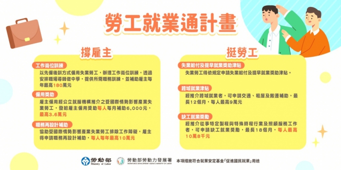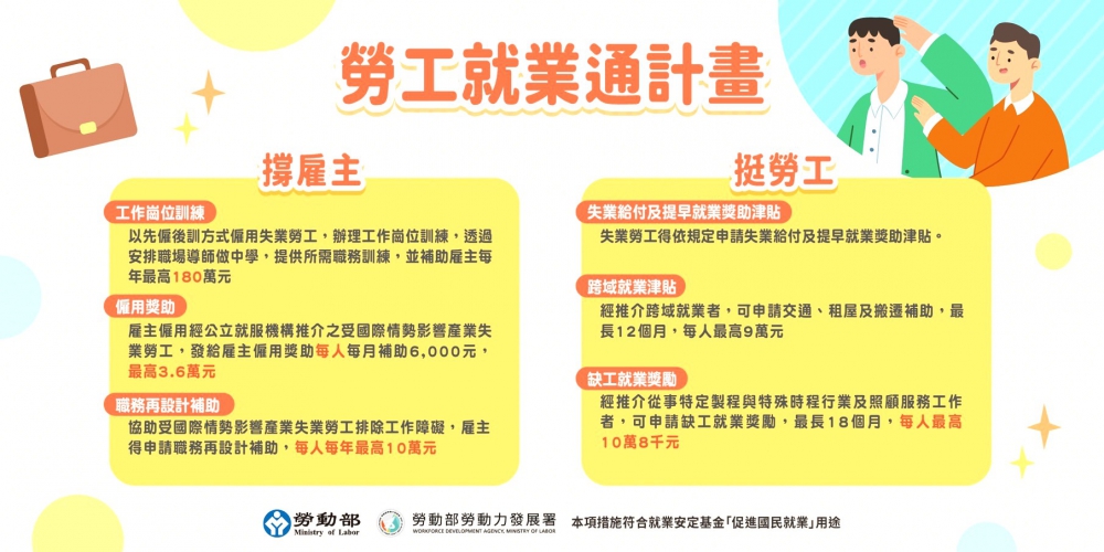 勞動部相關因應措施包括強化版僱用安定、勞工再充電計畫、勞工就業通計畫等,期望透過勞動部各項支應政策,協助受影響產業提升韌性、確保勞工安定就業,攜手共度挑戰。