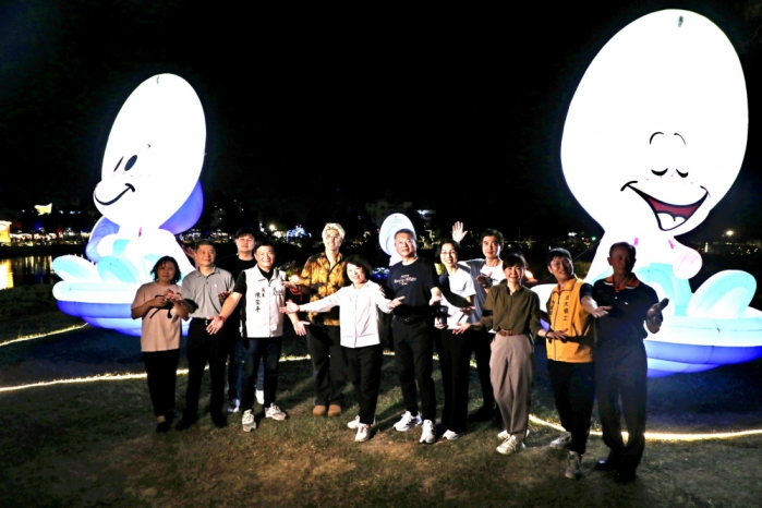 市長黃敏惠與來賓站在湖畔,與遊客共享這場幸福、夢幻交織的夜晚,民眾紛紛拿出手機捕捉精彩瞬間。