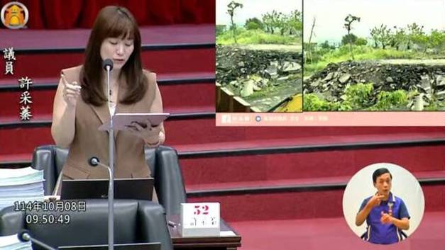 許采蓁今天於議會指出,大坪頂露營區旁邊的一處土地,她去調空拍圖,2020年3月還是一片綠地,今年3月山頭已被挖得亂七八糟,她發現整塊地都是保護區,現在是農地挖不夠 連保護區都不放過嗎?,她認為保護區具有水土保持功效及環境保護作用,使用與開發行為應更加小心。