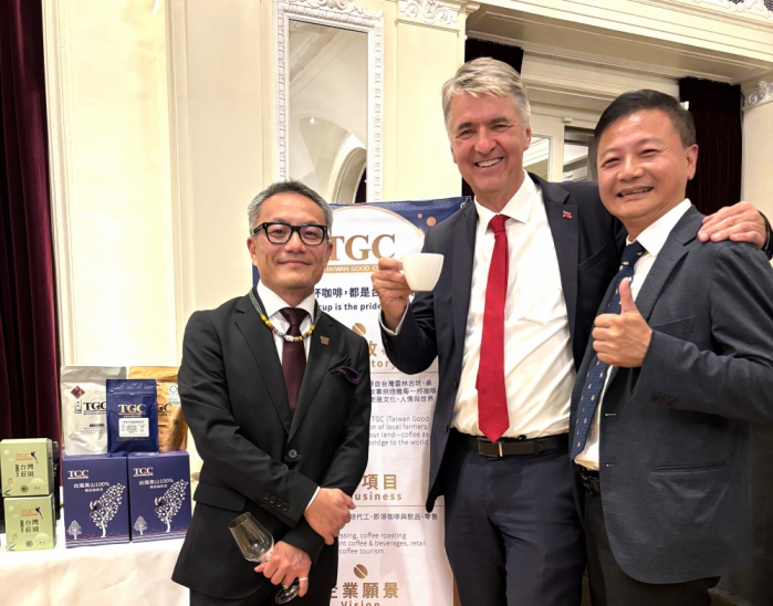 【記者陳信利/雲林報導】台灣駐瑞士代表處昨天(9日)在瑞士伯恩美景飯店舉辦國慶酒會,由駐瑞士代表王思為主持,榮獲「雲林良品」金質獎的雲林古坑TGC咖啡受邀參與盛會,將台灣精品咖啡帶向國際舞台,傳遞有溫度的台灣好咖啡到瑞士,在國際舞台上與國際接軌,讓世界看見台灣!
