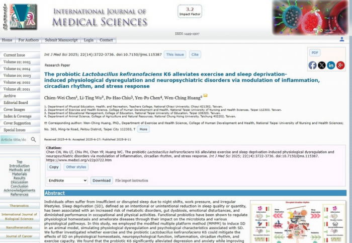 【記者張文一嘉義報導】嘉義大學體育與健康休閒學系陳建瑋助理教授,攜手臺北護理健康大學、臺北教育大學及中興大學研究團隊,近期於國際知名醫學期刊《International Journal of Medical Sciences》發表最新研究成果。研究團隊成功證實,補充益生菌K6能有效減輕憂鬱與焦慮症狀,改善葡萄糖耐受性及耐力運動表現;此外,更能透過降低發炎反應、調節晝夜節律基因及緩解壓力來全面提升整體健康。
