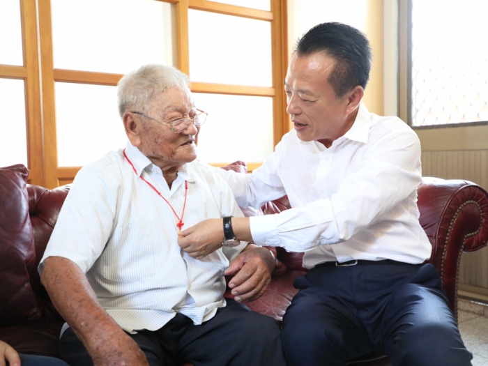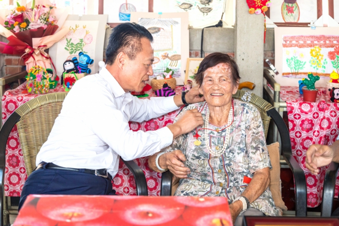 【雲嘉特派員陳信利/嘉義縣報導】10月29日是重陽節,嘉義縣今年共有127位百歲人瑞(滿百51位、逾百76位),縣長翁章梁提前拜訪百歲人瑞義竹鄉黃清海先生及布袋鎮莊翁兜女士,親自致贈縣府重陽禮金9000元及衛生福利部金鎖片,並頒贈今年滿百的莊翁兜女士總統府敬老狀,家人簇擁慶賀、場面溫馨。
