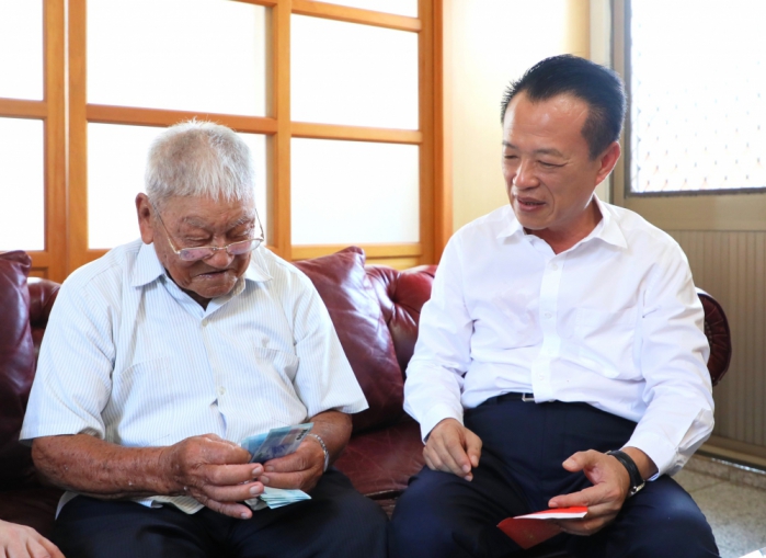 翁縣長除親贈重陽禮金紅包到2位阿公阿嬤手中,也為他們戴上金鎖片,慶賀重陽佳節與壽比南山的喜悅。