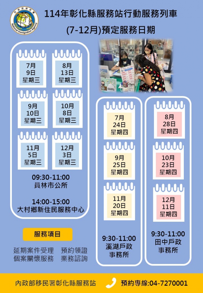 美食是連結人與在地文化的橋樑,內政部移民署多年來藉行動列車,深入各角落關懷新住民,彰化縣服務站與戶政所和公所合作,設櫃受理申請,解答各項在台生活疑問。