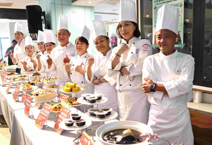 魏處長表示,菜單有蒲燒鰻魚珍珠米糕、炙燒豚香三色馬鈴薯慕斯小堡、菜頭粿、冰火雙享蜜香烤地瓜、焦糖蜂蜜醬佐南瓜、胡麻醬拌嫩雞胸、青木瓜輕拌蝦仁越式沙拉、蒜香醬燒排骨、琥珀香脆烤鴨。