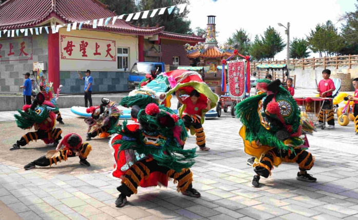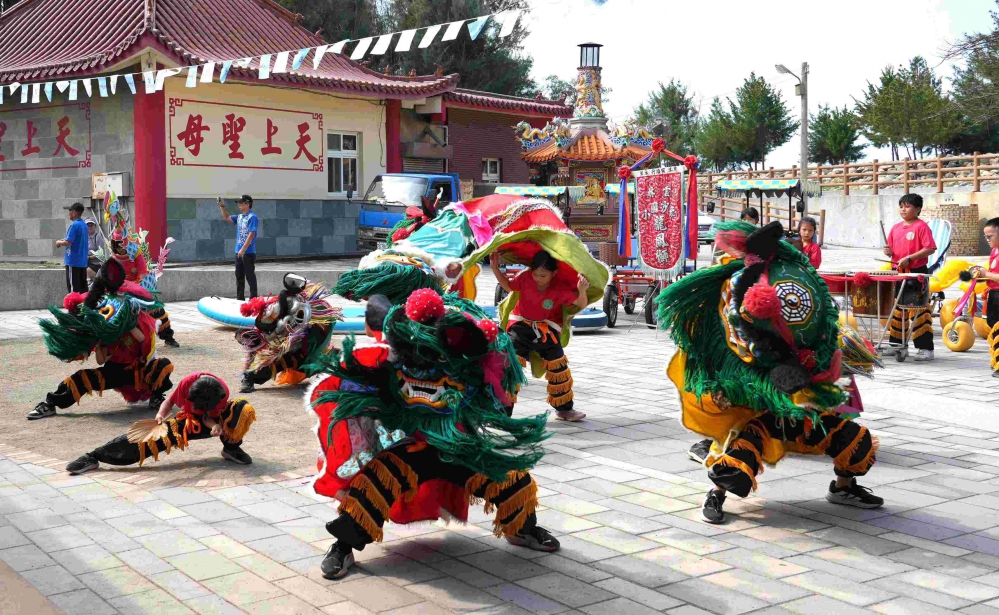 「2025雲林縣第五屆風箏衝浪公開賽及體驗活動」宣傳記者會,今天於三條崙海水浴場親水公園濱海大樓舉行,由飛沙國小龍鳯獅團熱鬧開場。