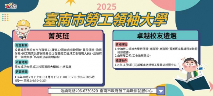 另已取得菁英班證書並經所屬公司或工會推薦者,可報名參加「勞工領袖大學卓越校友」遴選,收件日期自即日起至11月5日止。相關資訊可至勞工局網站查詢(https://web.tainan.gov.tw/jobtainan/)或洽(06)6330820轉303吳小姐。