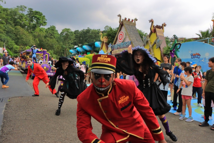 假日更有限定「狂歡列車遊行」,邀請變裝夠酷、夠美、夠可怕的民眾一同加入,一起大鬧劍湖山世界。