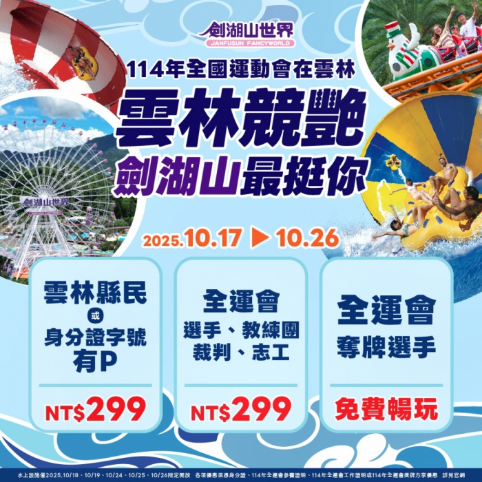 欣逢 114 年全國運動會將在雲林盛大舉辦,為響應體壇盛事並回饋鄉親,劍湖山世界主題樂園自10月17日起至26日止,推出「雲林競艷 劍湖山最挺你」超值優惠活動,力挺全運會,讓參賽選手及雲林鄉親都能以最優惠價格盡情暢玩!