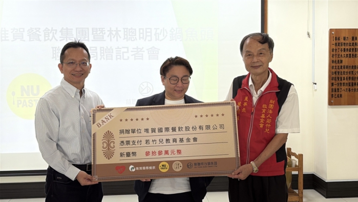 【記者張文一、任禮清嘉義報導】唯賀國際餐飲集團24日於「若竹兒教育基金會」,正式宣布NU PASTA x 天利食堂 × 林聰明沙鍋魚頭跨界聯名,共募集善款新台幣 66 萬元。由「唯賀國際餐飲集團」總經理吳家德與「林聰明沙鍋魚頭」執行長林佳慧,將象徵愛心的支票親手交付予「若竹兒教育基金會」董事長林朋輝,另同步捐贈予「安得烈慈善協會」,兩單位各獲贈33萬元。在觀賞若竹兒的表演後,林聰明沙鍋魚頭執行長林佳慧,並當場宣布加碼3萬元,捐贈若竹兒基金會。