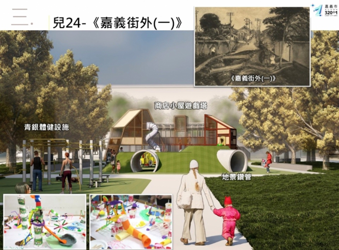 同時依據小朋友們的期待,建置滑梯、秋千、滑步車練習場等遊具與場域,更融合在地文化意象及陳澄波老師畫筆下的嘉義風光發想,打造兼具藝術、美學與休憩功能的都市綠地。