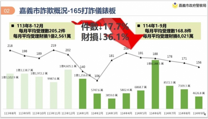 依據「165打詐儀錶板」統計數據分析,嘉義市114年1至9月平均每月受理詐欺168件、財損8,021萬元,相較於113年8至12月平均每月受理件數減少17.7%、財損減少36.1%,對於詐欺的發生、財損的金額,都呈現顯著的成效,嘉義市在市長黃敏惠帶領下,整合市府各局處團隊公私協力、擴大防詐宣導,嘉義市詐欺案件呈現緩降趨勢。在114年9月攔阻成效方面,共攔阻21件總計934萬餘元、查緝詐欺集團5團58人、查扣不法所得595萬餘元;在防制提領熱點部分,查獲外籍提領車手8名,均為馬來西亞籍,其中1名車手身上甚至查扣多達50張金融卡,經嘉義地方檢察署聲請羈押,也經法院全數裁定准予羈押中,強力斬斷提領車手。
