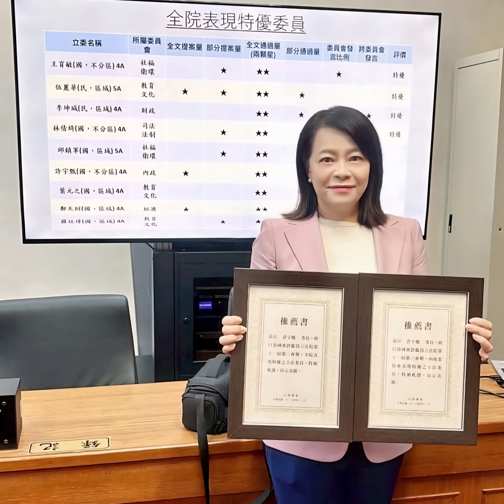 此外,推動福國利民的法案,更是她每天的責任;讓政府更有效率、社會更有溫度,是她持續努力的方向,也是身為立委的責任。