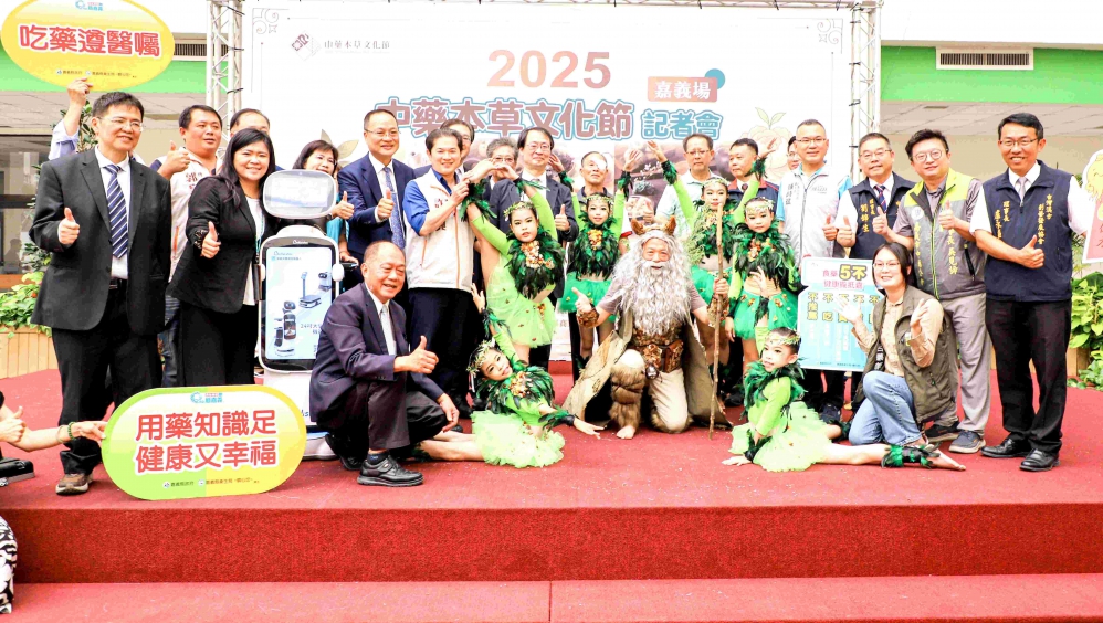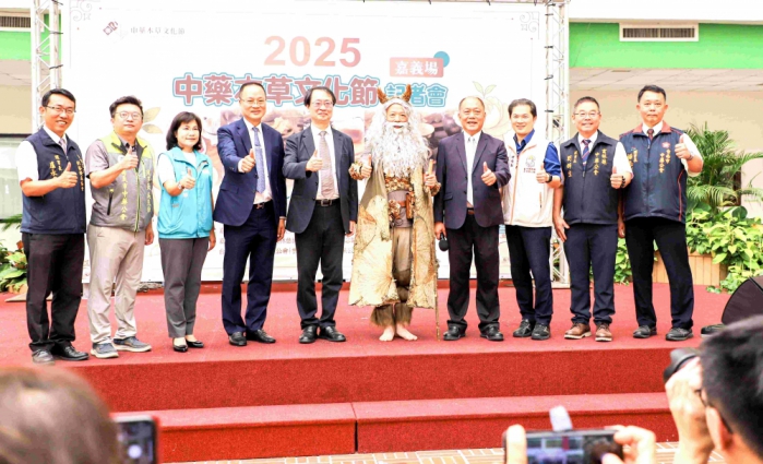 【雲嘉特派員陳信利/嘉義縣報導】衛生福利部及中華民國中藥商業同業公會全國聯合會主辦「2025中藥本草文化節嘉義場」,活動將在11月8日至9日於國立故宮博物院南部院區登場,今天(5日)舉行宣傳記者會,嘉義縣長翁章梁穿上以中藥材製成的精緻服裝,化身神農大帝宣傳中藥本草文化節!