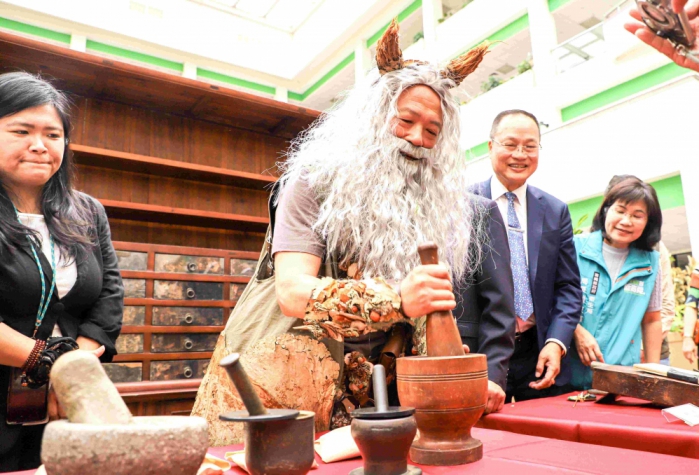 記者會中縣長翁章梁化身「神農氏」重現古人試藥救民傳說,「靈膳魔導師」AI機器人也在活動中登場,透過使用者與機器人之間的一問一答,展現科技結合傳統智慧的創新力量。
