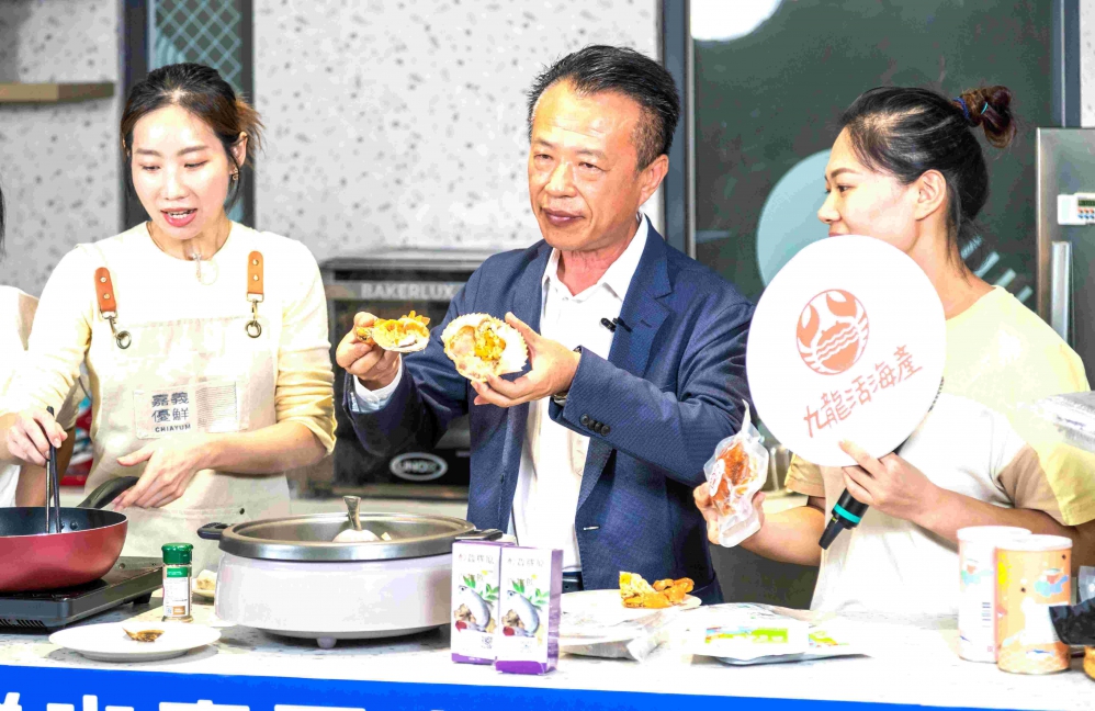 同時介紹黑麻蟹(熟凍紅蟳)、威士忌一口吃烏魚子、咔啦蝦、虱目魚尬尾魚鬆等即食精品,咪咪也大讚嘉義水產優質又好吃。