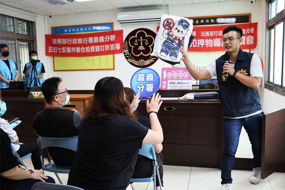 拍賣前,嘉義市政府警察局刑警大隊人員與分署行政執行官共同進行政府普發現金及反詐騙宣導,向在場民眾介紹此次政府普發現金1萬元資訊及提醒民眾注意各種詐騙方法,強調各種誘人輕鬆投資賺錢的訊息詐騙伎倆,凡是指示到提款機作匯款操作的訊息皆是詐騙手法,請民眾千萬不要上當,尤其不要貪圖小利受人請託代為取貨、取款,以免成為詐騙共犯,若有任何詐騙疑慮,也請撥打「反詐騙165專線」洽詢。