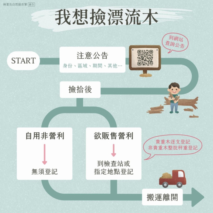 颱風過後如需查詢漂流木清理、撿拾規定等資訊,可至林業及自然保育署「漂流木專區」查詢最新資訊,以確保自身權益並共同維護公共安全與環境資源,網址:https://www.forest.gov.tw/Driftwood。