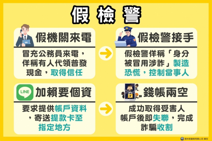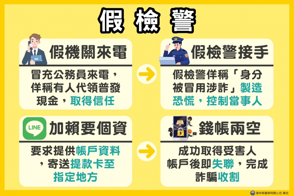縣警局呼籲民眾一定要記得普發1萬「假檢警」、「釣魚簡訊、假網站」詐騙手法及「防詐4不原則」。