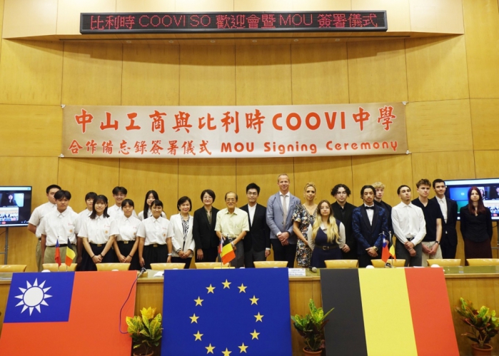 「比利時歡迎會暨MOU簽署儀式」,比利時COOVI中學包括技術顧問兼協調員Olivier Dumoulin與教學協調主任Laura Vandebroeck等師生共10人。中山工商由陳國清董事長率李昱平校長、國際教育處張佳琪主任、師生代表一同出席。比利時台北辦事處法蘭德斯經貿組組長吳良鈺及教育部國教署原民特教組林淑敏副組長到場致詞,駐比利時代表處李彥儀組長以線上見證簽約儀式。