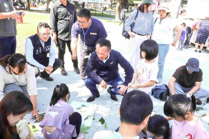 園區市集氣氛悠閒,許多民眾參與DIY活動,而梅嶺美術館即將進行裝修,館方也開放館內牆面供民眾自由創作,許多家長帶著孩子在牆上繪畫,場面溫馨,翁縣長也親自體驗,在牆上揮毫紀念。(圖/嘉義縣政府提供)