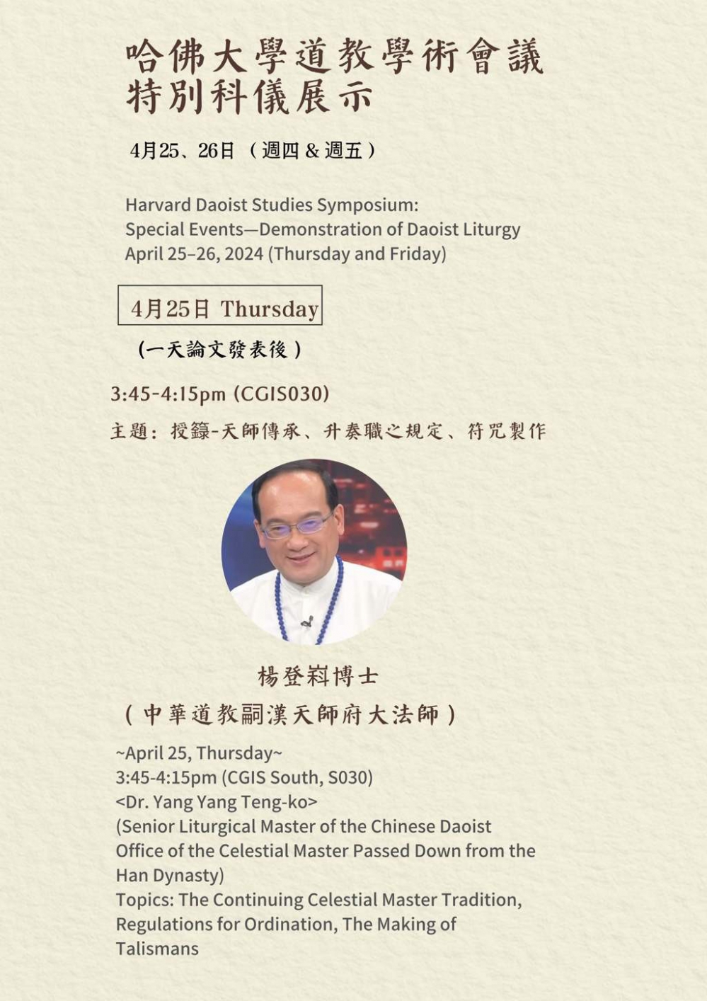 素有「警界孔子」之稱的高哲翰講座教授對此評價指出,哈佛大學神學院雖設有世界宗教研究中心,長期研究基督教、猶太教、伊斯蘭教、佛教等主要宗教,卻唯獨缺乏對道教的系統性研究。這一學術空白,在哈佛大學亞洲中心主任羅柏松(James Robson) 教授及佛教依法法師的積極推動下得以彌補,於2024年4月25日至26日破天荒舉辦了首場道教學術研究會議及科儀展演,楊登嵙教授正是此次活動的關鍵演講者。