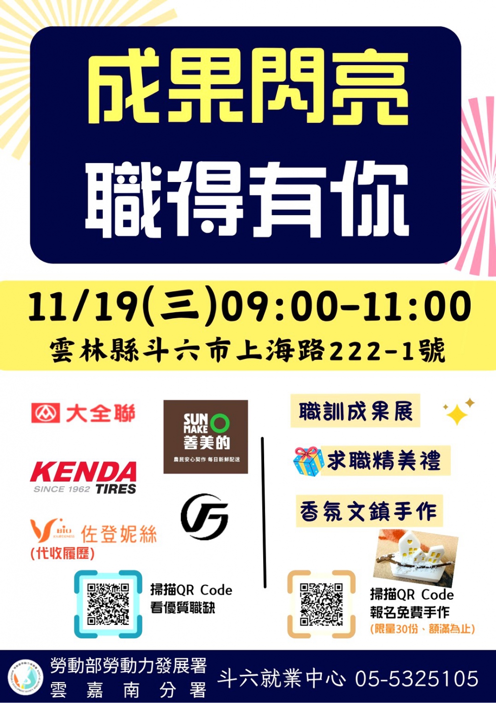 【記者陳信利/雲林報導】勞動部勞動力發展署雲嘉南分署斗六就業中心為協助待業及轉職民眾順利投入職場,將於11月19日(周三)上午9時至11時,在中心1樓舉辦「成果閃亮 職得有你」現場徵才活動。
