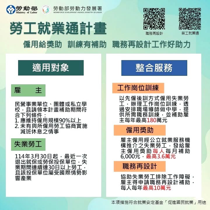劉主任指出,為協助受國際情勢影響致失業的勞工重返職場,勞動部推動「勞工就業通計畫」,整合工作崗位訓練、僱用獎助與職務再設計補助三大措施。