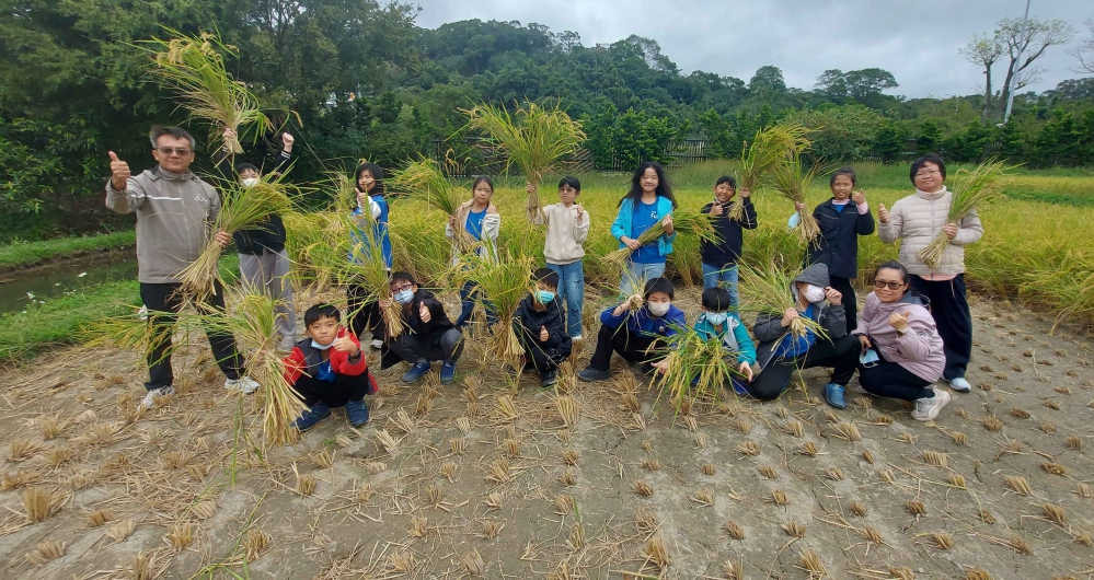 戶外教學活動最後由蕭佩真老師和學生手握鐮刀,彎腰割下金黃稻穗,那一刻,孩子不僅在收割,更感謝天地滋養