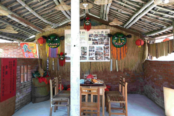 社區透過空間整理與展示,再現昔日武館風華,保留獅頭、老照片等記憶符號,並以廢棄農具、竹管風鈴、斗笠燈具等素材,呈現富含農村美學的生活語彙。