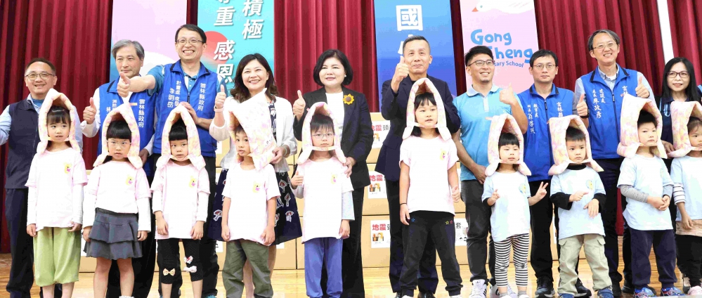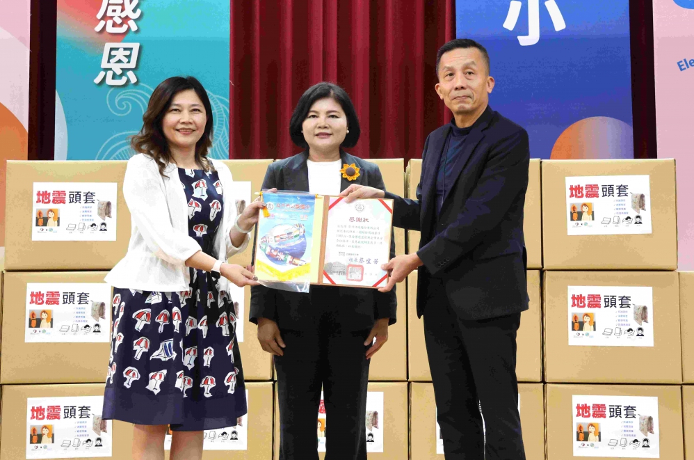由紡織綜合所黃博雄協理贈送1500頂地震防護頭套給蔡宜芳校長,並由蔡校長代表全體師生致上感謝狀,張縣長等人見證,在温馨的氣氛中傳達對學童的深深關懷。