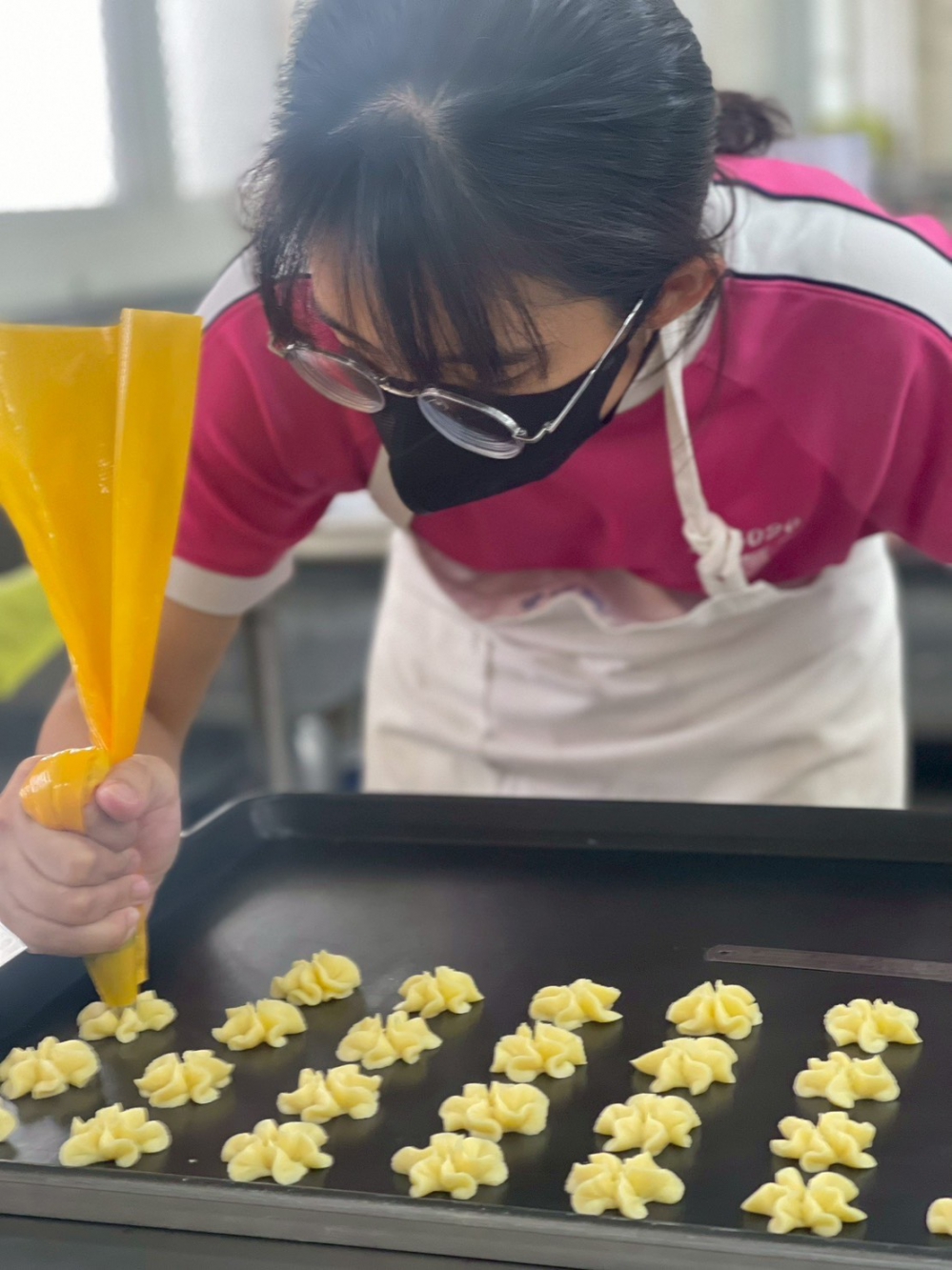 食品加工職種全國第1名金手獎的吳翊斳同學,國中時期是學校籃球隊的一員,把球員堅韌的信念與勤奮的態度帶入技藝訓練中,她表示:「選手訓練的過程極為辛苦,必須不斷反覆練習,精進技術的精準度與熟練度。」但她將這種高壓訓練視為對自我的磨練,秉持著「把吃苦當成吃補」的堅強信念與勤奮態度,最終在正式比賽中穩定發揮,與王莉雅一同拿下食品加工職種個人第1、2名以及團體第1名的雙重榮耀!